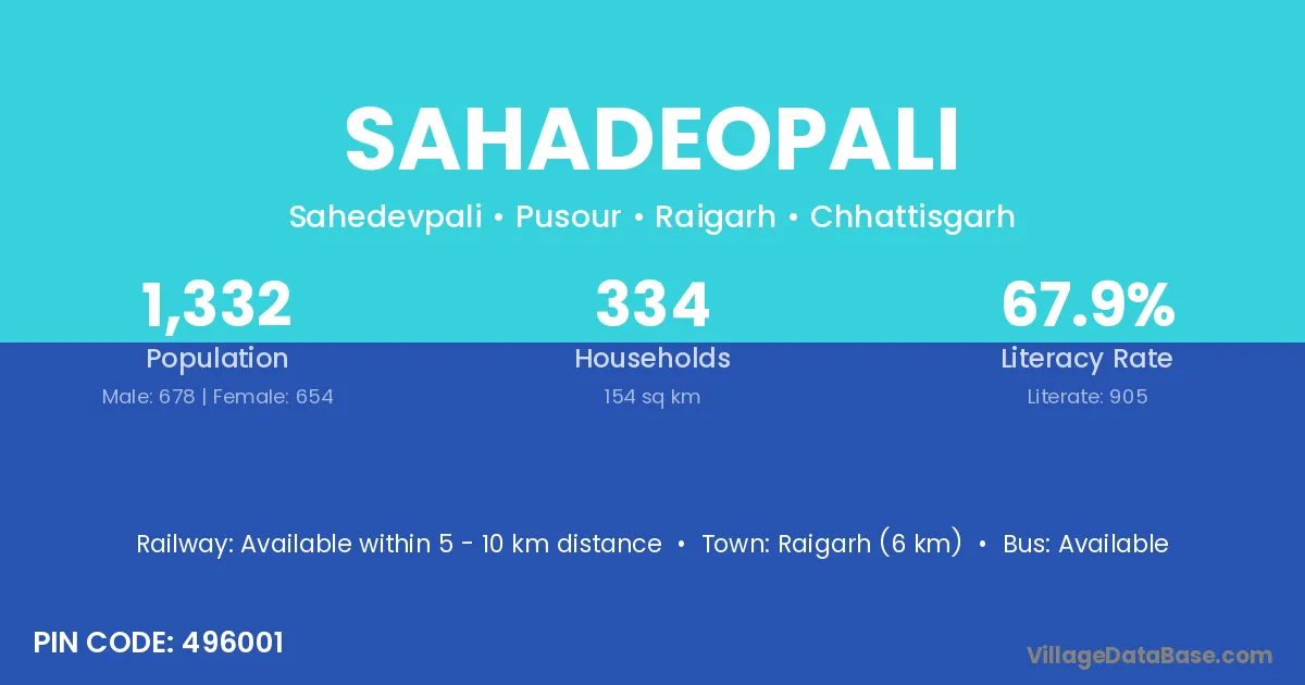 Raigarh (6 km) is the nearest town to Sahadeopali village for major economic activities and is located approximately 6 km away.
