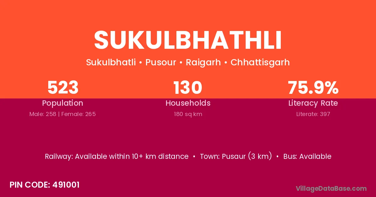 According to Census 2011 information, the village code of Sukulbhathli village is 491001.