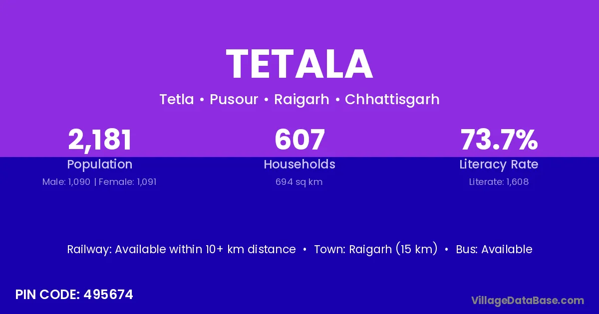 Raigarh (15 km) is the nearest town to Tetala village for major economic activities and is located approximately 15 km away.