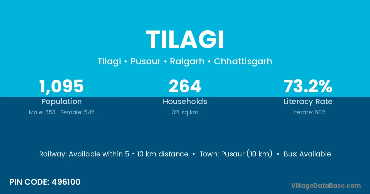 Pusaur (10 km) is the nearest town to Tilagi village for major economic activities and is located approximately 10 km away.