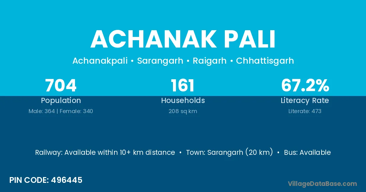 Sarangarh (20 km) is the nearest town to Achanak Pali village for major economic activities and is located approximately 20 km away.