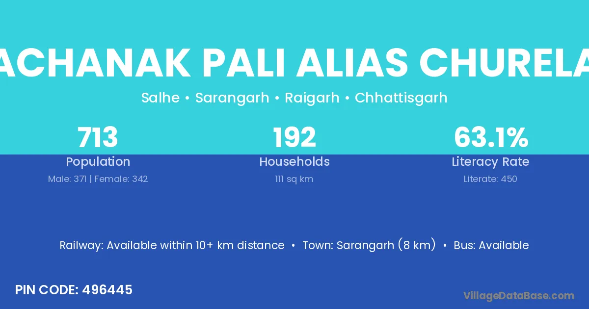 Achanak Pali Alias Churela village has a total population of 713 people, of which 371 are males and 342 are females.