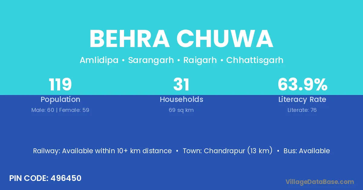 Behra Chuwa village has a total population of 119 people, of which 60 are males and 59 are females.