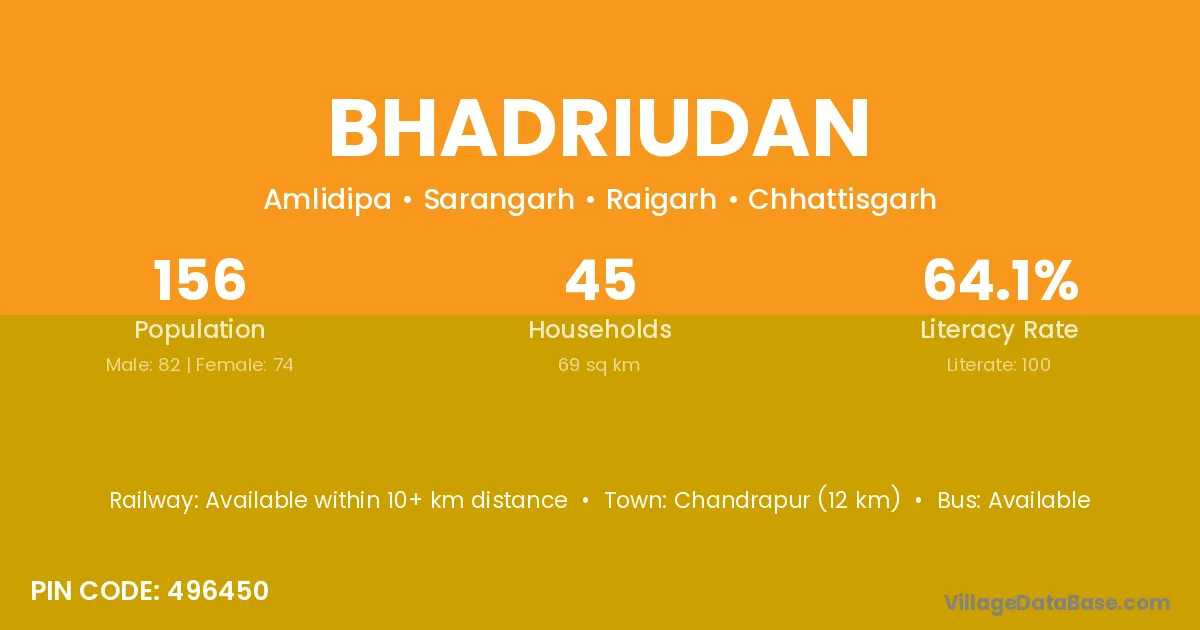 Bhadriudan village has a total population of 156 people, of which 82 are males and 74 are females.