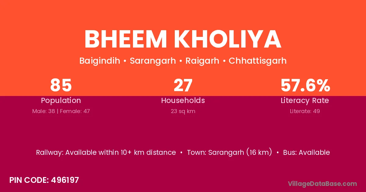 Sarangarh (16 km) is the nearest town to Bheem Kholiya village for major economic activities and is located approximately 16 km away.