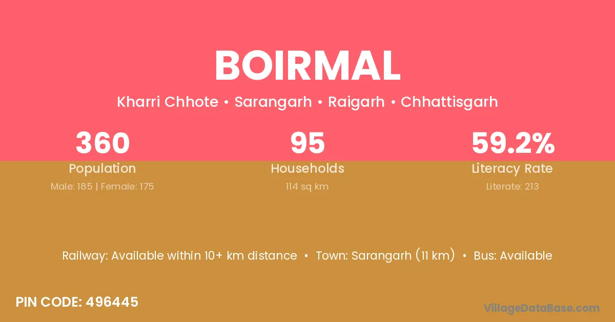 Sarangarh (11 km) is the nearest town to Boirmal village for major economic activities and is located approximately 11 km away.