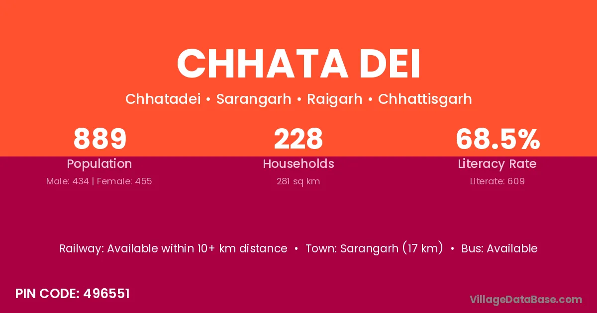 Sarangarh (17 km) is the nearest town to Chhata Dei village for major economic activities and is located approximately 17 km away.