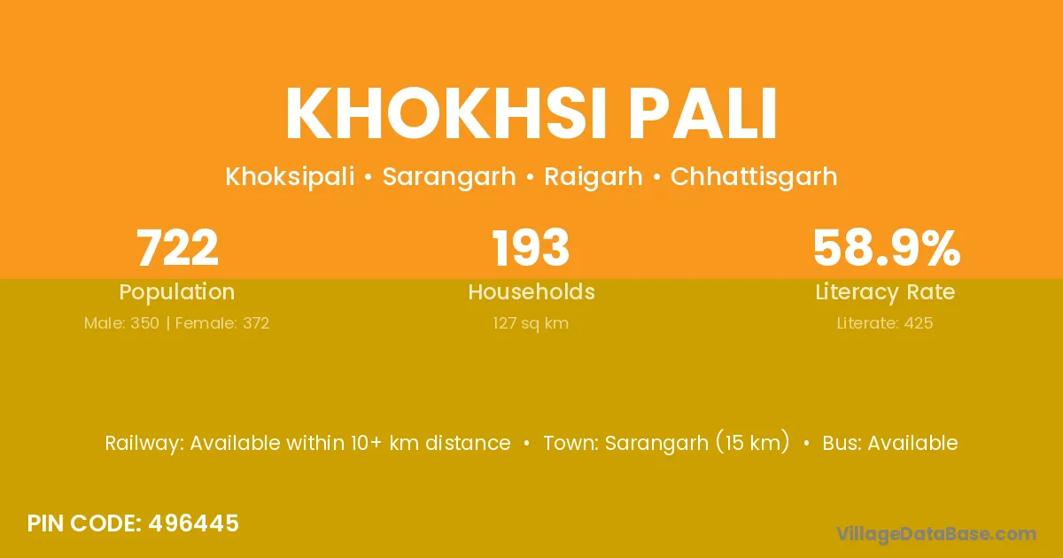 Sarangarh (15 km) is the nearest town to Khokhsi Pali village for major economic activities and is located approximately 15 km away.