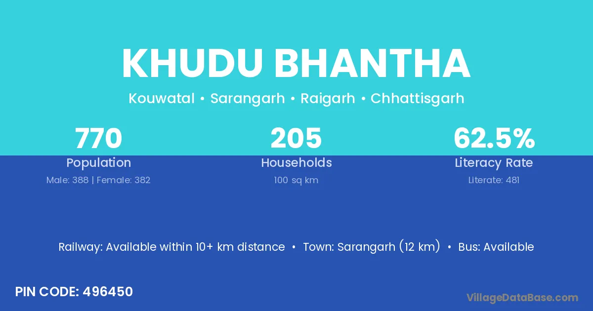 Khudu Bhantha village has a total population of 770 people, of which 388 are males and 382 are females.