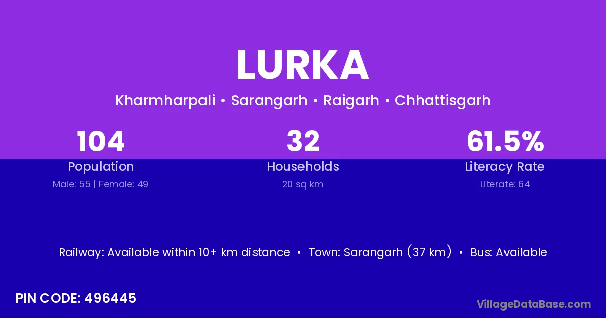 Sarangarh (37 km) is the nearest town to Lurka village for major economic activities and is located approximately 37 km away.