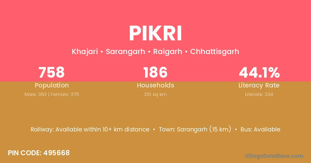 Sarangarh (15 km) is the nearest town to Pikri village for major economic activities and is located approximately 15 km away.
