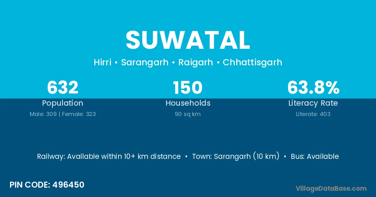 Sarangarh (10 km) is the nearest town to Suwatal village for major economic activities and is located approximately 10 km away.