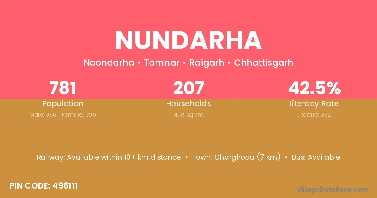 Nundarha village is located in the Tamnar Tehsil of the Raigarh district in Chhattisgarh .