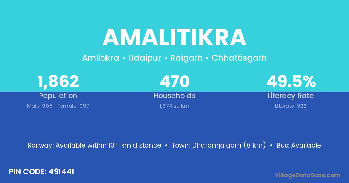 Dharamjaigarh (8 km) is the nearest town to Amalitikra village for major economic activities and is located approximately 8 km away.