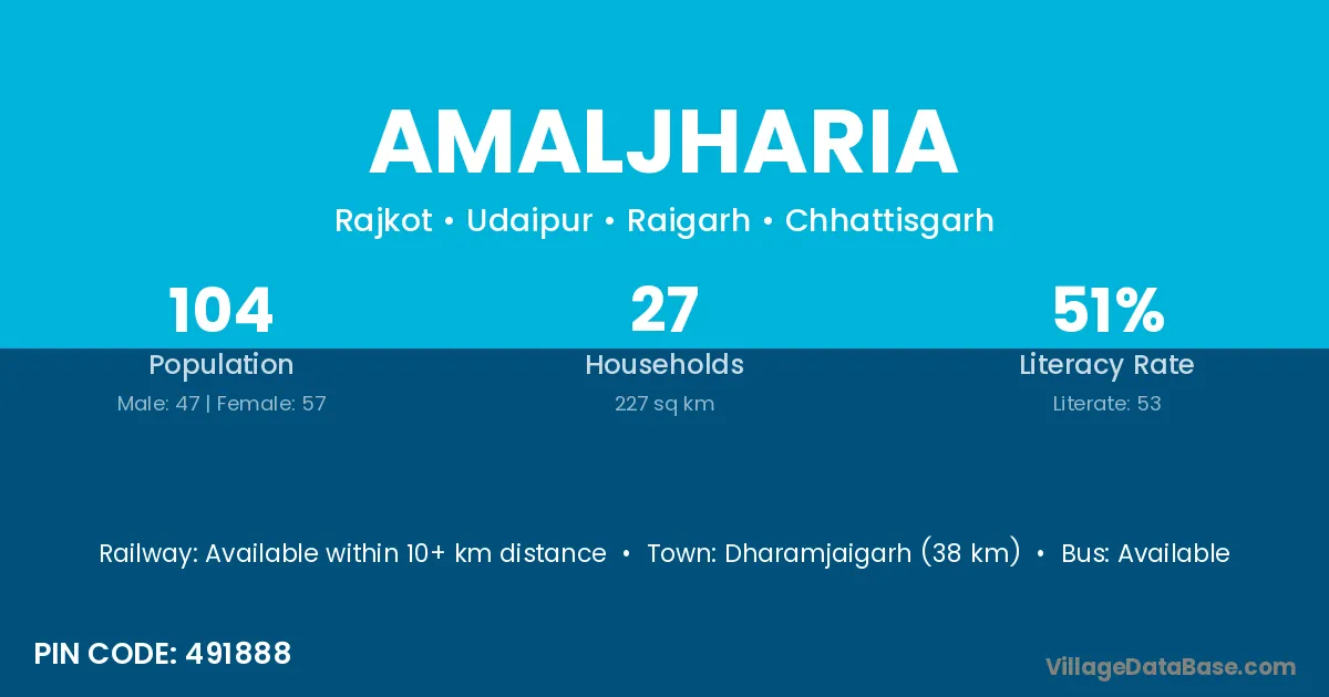 Dharamjaigarh (38 km) is the nearest town to Amaljharia village for major economic activities and is located approximately 38 km away.
