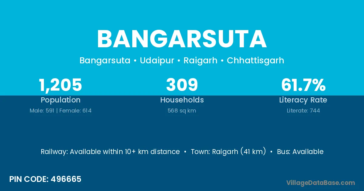 Raigarh (41 km) is the nearest town to Bangarsuta village for major economic activities and is located approximately 41 km away.