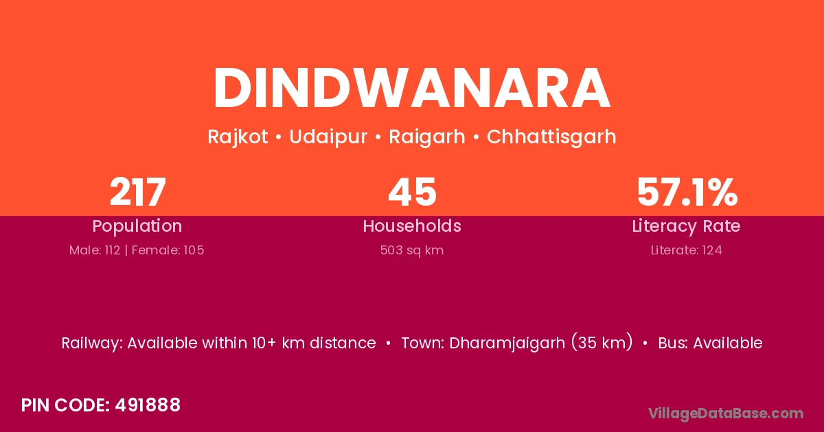 Dharamjaigarh (35 km) is the nearest town to Dindwanara village for major economic activities and is located approximately 35 km away.