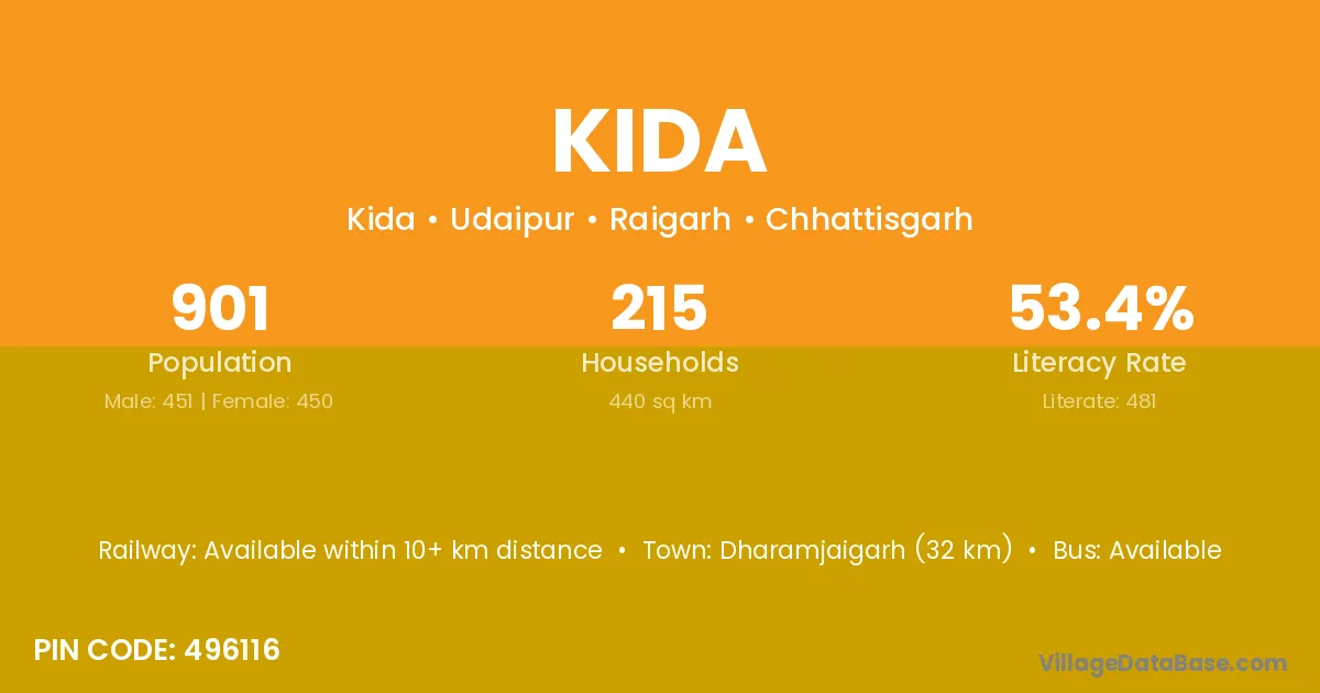 Dharamjaigarh (32 km) is the nearest town to Kida village for major economic activities and is located approximately 32 km away.