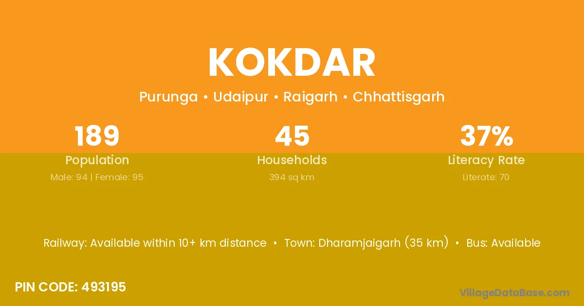 Dharamjaigarh (35 km) is the nearest town to Kokdar village for major economic activities and is located approximately 35 km away.