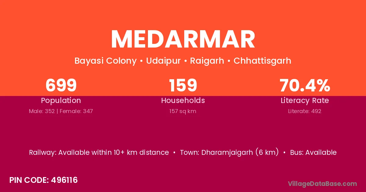 Dharamjaigarh (6 km) is the nearest town to Medarmar village for major economic activities and is located approximately 6 km away.