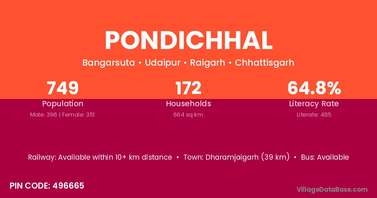 Dharamjaigarh (39 km) is the nearest town to Pondichhal village for major economic activities and is located approximately 39 km away.