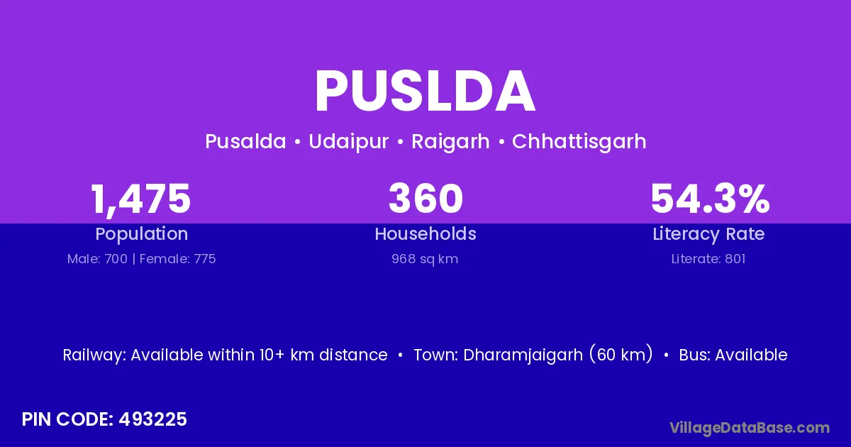 Dharamjaigarh (60 km) is the nearest town to Puslda village for major economic activities and is located approximately 60 km away.