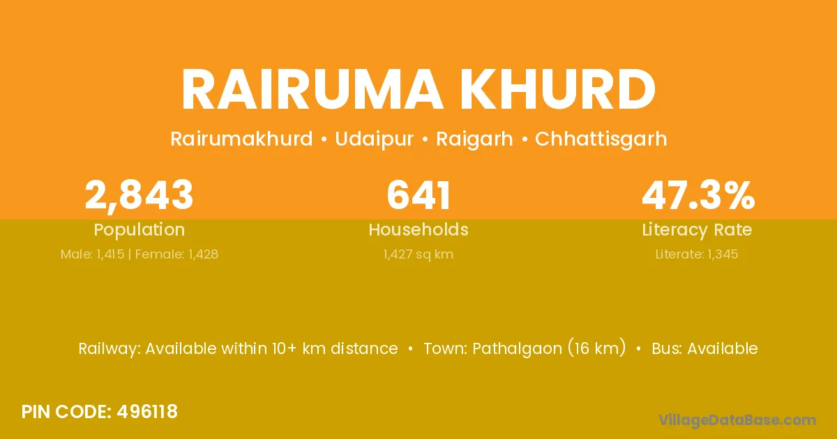 Pathalgaon (16 km) is the nearest town to Rairuma Khurd village for major economic activities and is located approximately 16 km away.