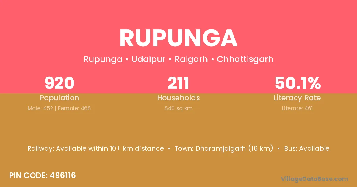Rupunga village has a total population of 920 people, of which 452 are males and 468 are females.