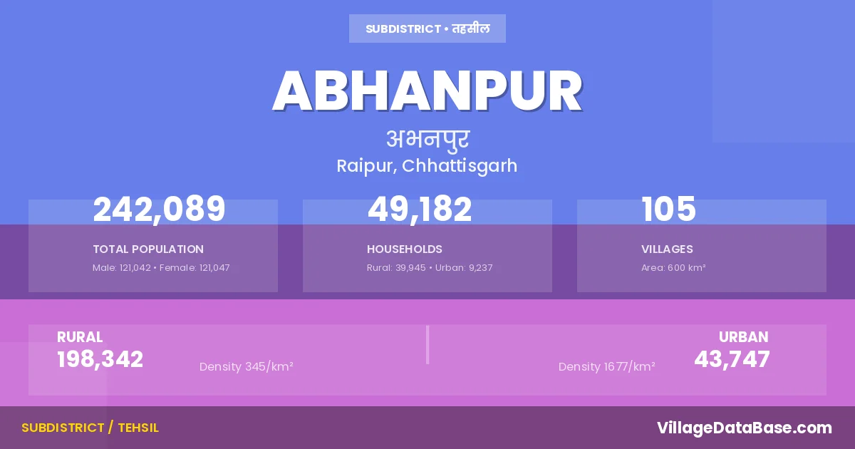 According to the 2011 census The total area of Abhanpur Tehsil is 600 km², with a population of 242089 people. The population density is 403 inhabitants per square kilometre, and there are approximately 49182 houses in the sub district.