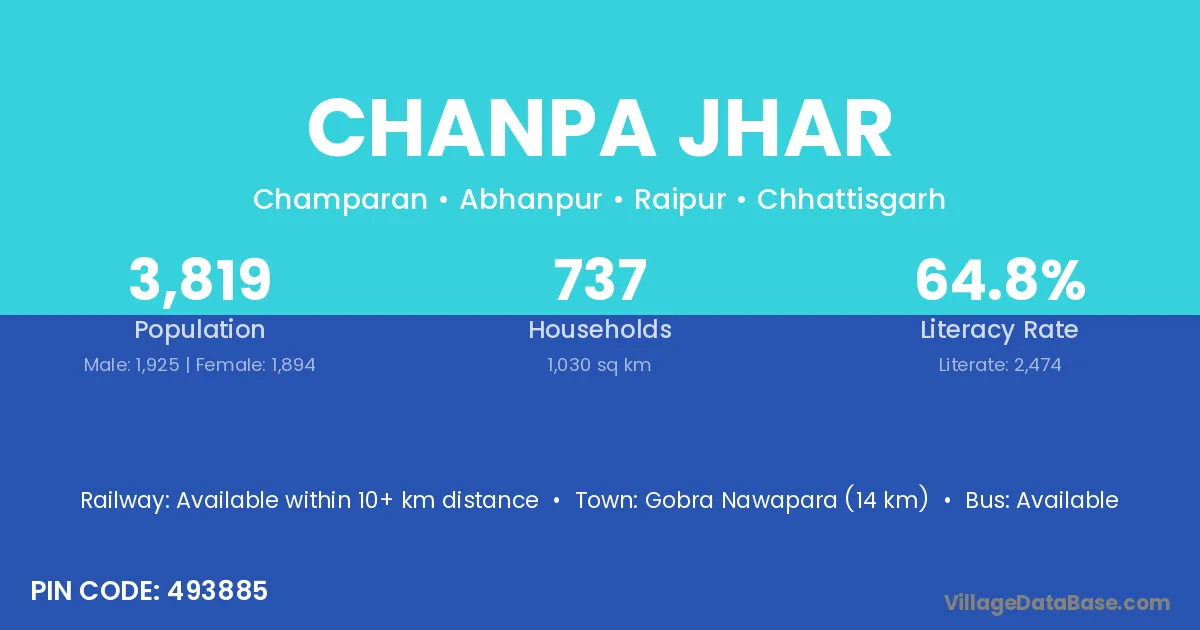 Gobra Nawapara (14 km) is the nearest town to Chanpa Jhar village for major economic activities and is located approximately 14 km away.