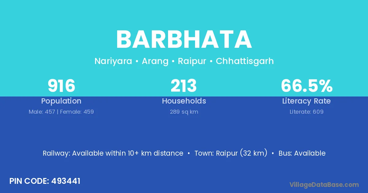 Raipur (32 km) is the nearest town to Barbhata village for major economic activities and is located approximately 32 km away.