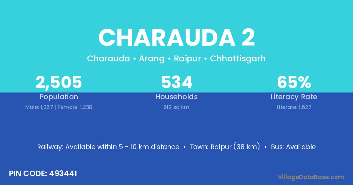 Raipur (38 km) is the nearest town to Charauda 2 village for major economic activities and is located approximately 38 km away.