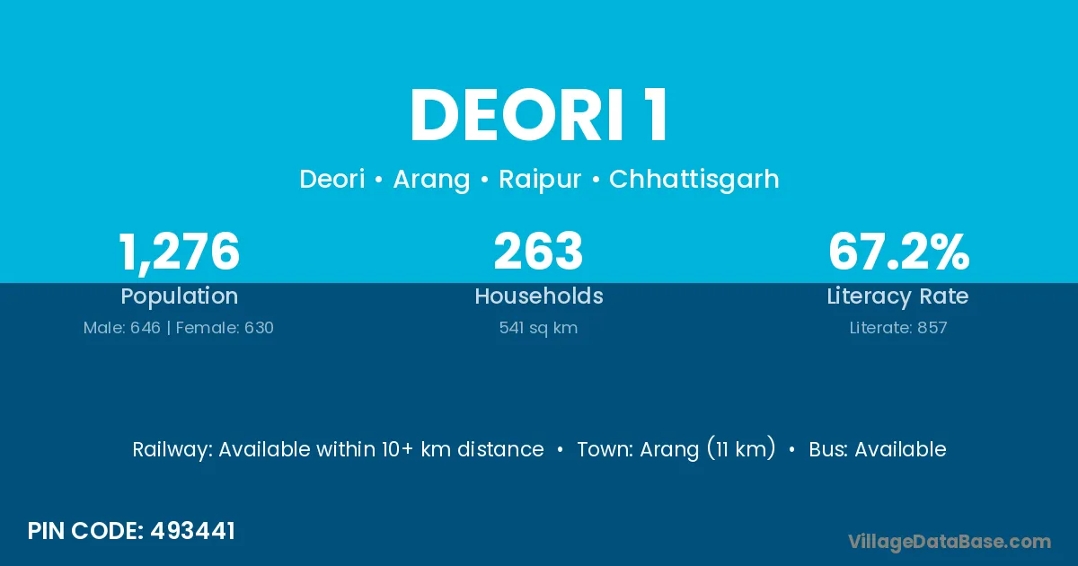 Deori 1 village has a total population of 1,276 people, of which 646 are males and 630 are females.