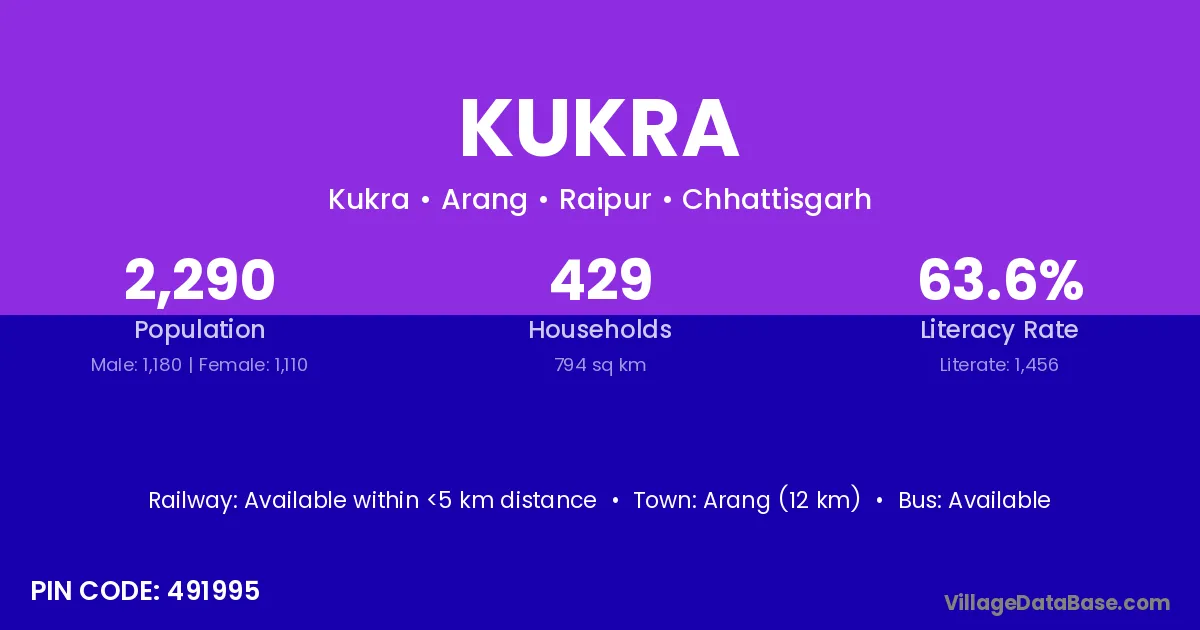 Arang (12 km) is the nearest town to Kukra village for major economic activities and is located approximately 12 km away.