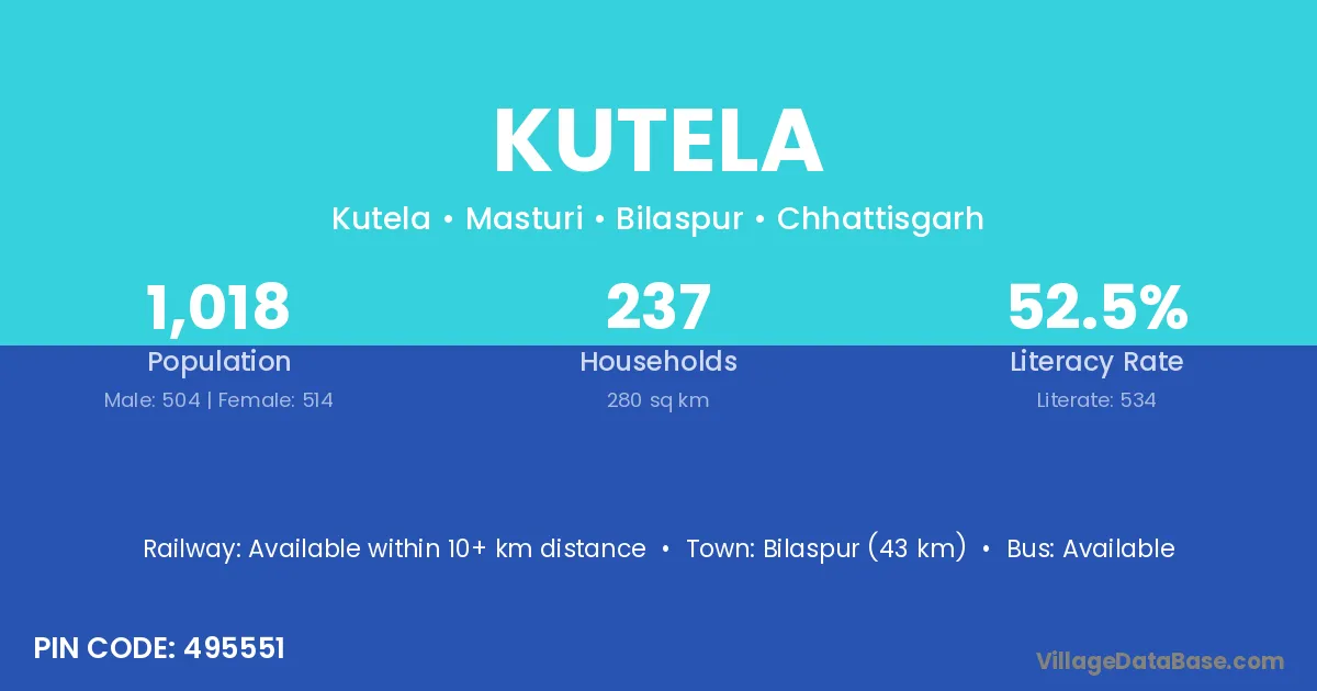 Kutela village has a total population of 1,908 people, of which 945 are males and 963 are females.
