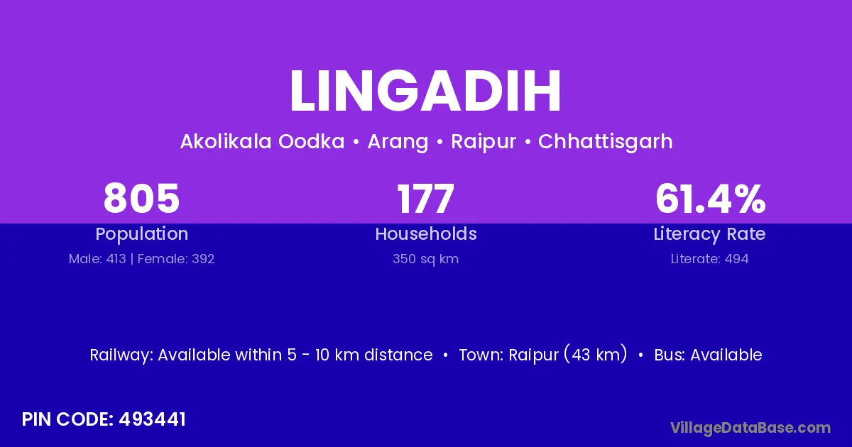 Raipur (43 km) is the nearest town to Lingadih village for major economic activities and is located approximately 43 km away.