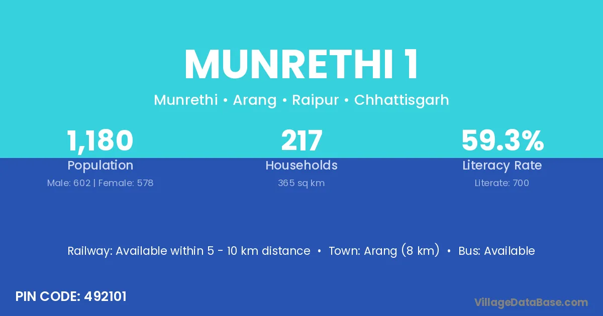 Arang (8 km) is the nearest town to Munrethi 1 village for major economic activities and is located approximately 8 km away.