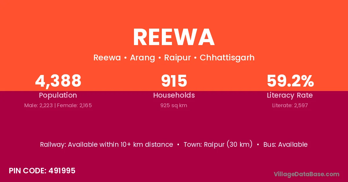 Raipur (30 km) is the nearest town to Reewa village for major economic activities and is located approximately 30 km away.