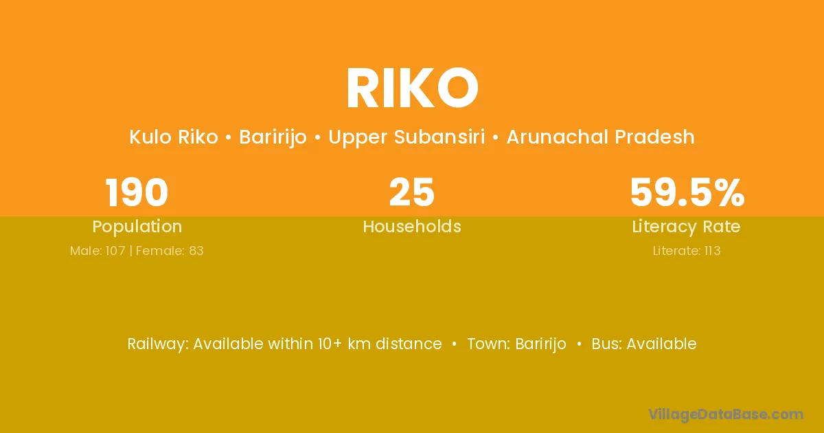 The literacy rate of Riko village is 63.73%. Male literacy stands at 69.82% and female literacy at 57.55%.