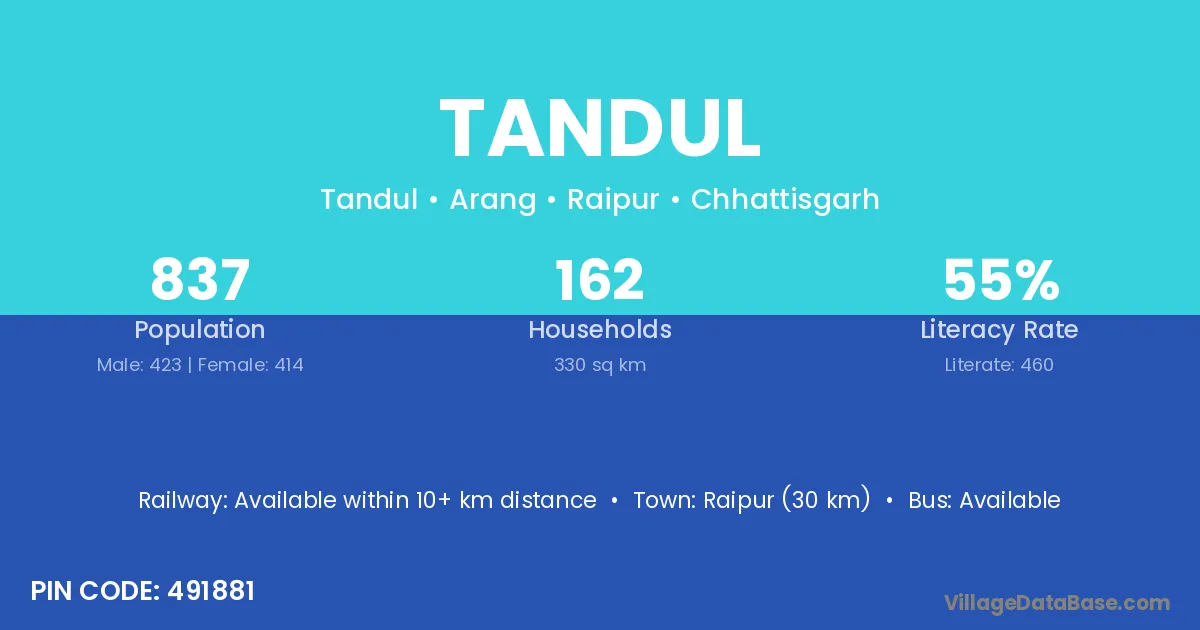 Raipur (30 km) is the nearest town to Tandul village for major economic activities and is located approximately 30 km away.