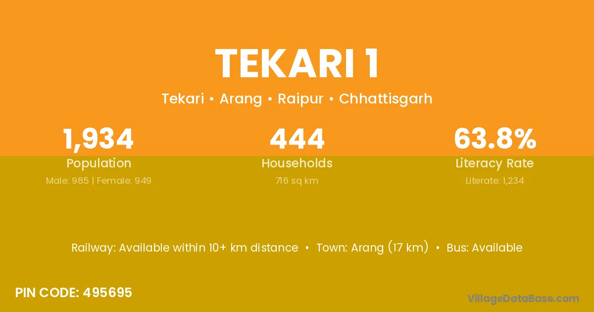 Tekari 1 village has a total population of 1,934 people, of which 985 are males and 949 are females.