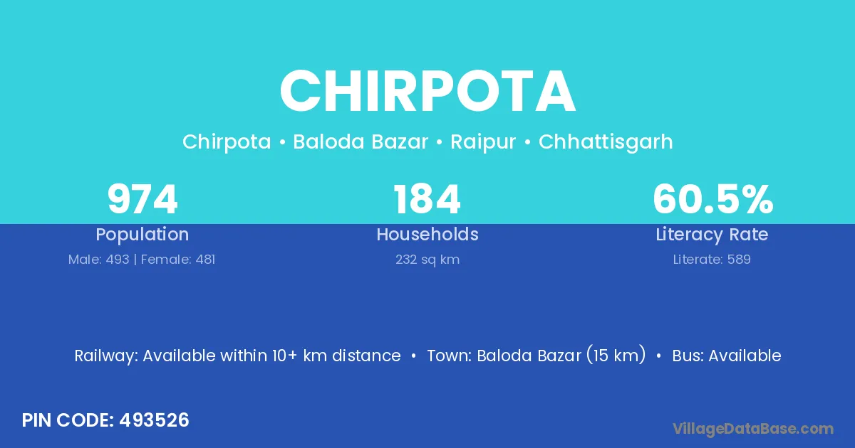Baloda Bazar (15 km) is the nearest town to Chirpota village for major economic activities and is located approximately 15 km away.