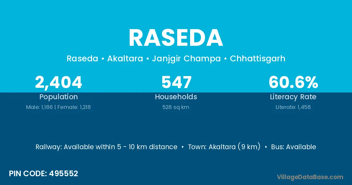 Baloda Bazar (10 km) is the nearest town to Raseda village for major economic activities and is located approximately 10 km away.