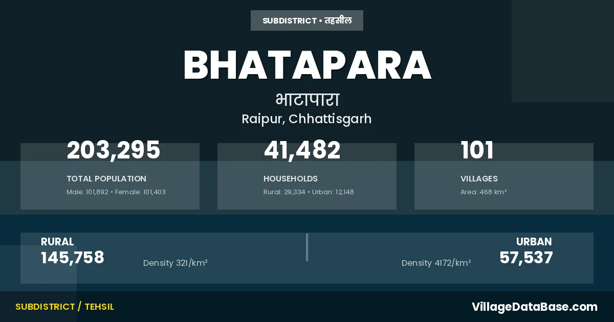 According to the 2011 census The total area of Bhatapara Tehsil is 468 km², with a population of 203295 people. The population density is 435 inhabitants per square kilometre, and there are approximately 41482 houses in the sub district.