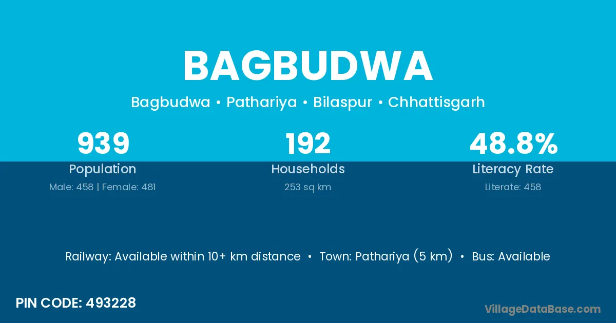 Bhatapara (23 km) is the nearest town to Bagbudwa village for major economic activities and is located approximately 23 km away.