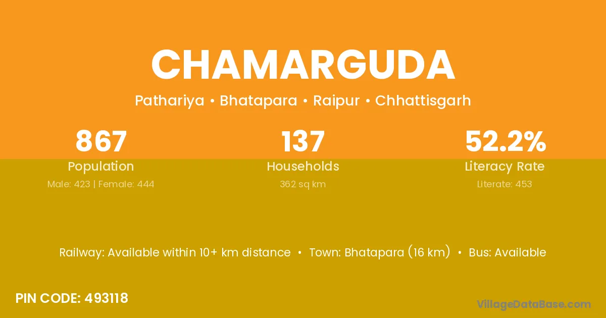 Bhatapara (16 km) is the nearest town to Chamarguda village for major economic activities and is located approximately 16 km away.