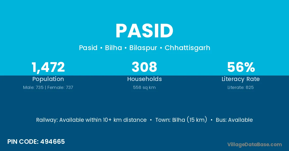 Bhatapara (28 km) is the nearest town to Pasid village for major economic activities and is located approximately 28 km away.