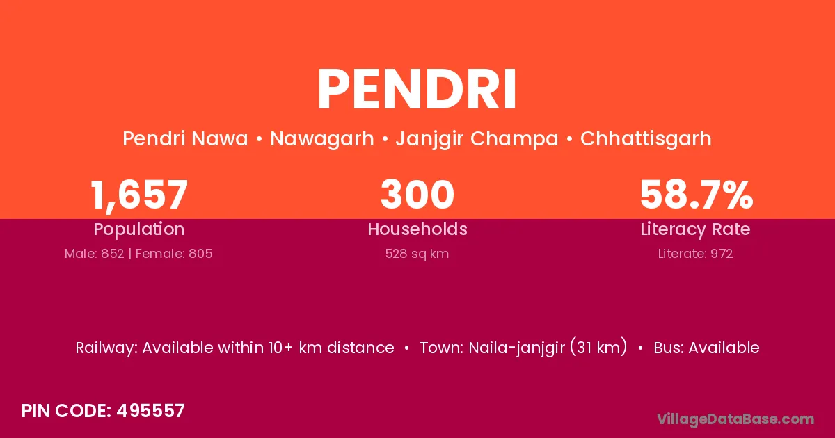 Bhatapara (6 km) is the nearest town to Pendri village for major economic activities and is located approximately 6 km away.