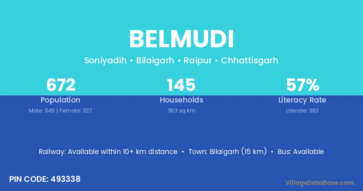 Bilaigarh (15 km) is the nearest town to Belmudi village for major economic activities and is located approximately 15 km away.