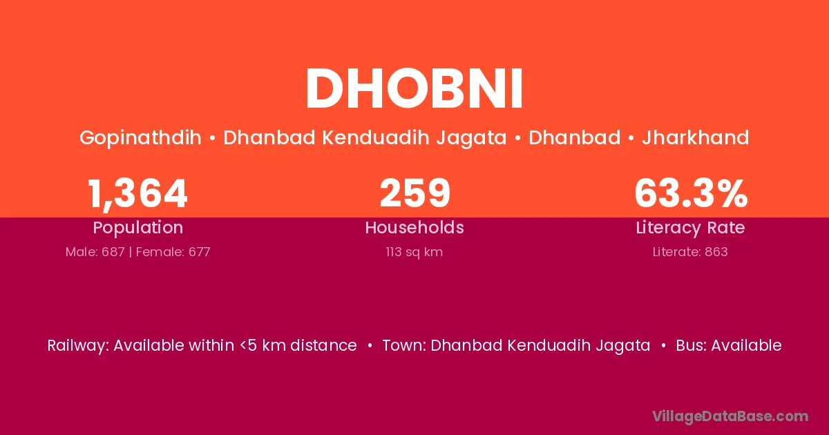 The literacy rate of Dhobni village is 66.51%. Male literacy stands at 78.52% and female literacy at 54.62%.